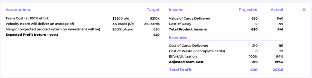 Cost of Delivery: If we assume a team size of 7 and an approximate daily cost for the team of $3,500 this gives us a reasonable estimate for a typical agile team. The cost of delivery is the daily cost multiplied by the duration.