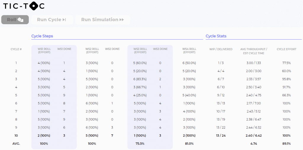 ROLL (EFFORT): The Effort indicates the % of the dice roll that is able to used. E.g. if the backlog had insufficient features, or if the WiP limit requires moving less than the dice roll.